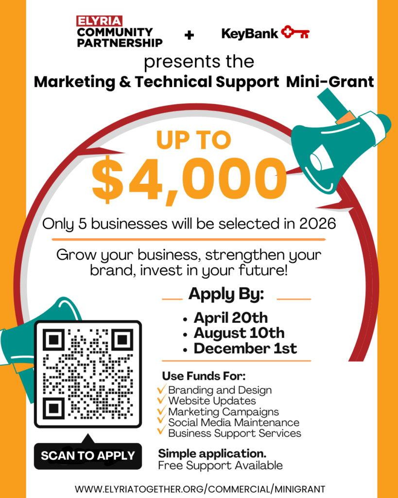 Grants are awarded on a first-come, first-served basis and are evaluated by the Elyria Community Partnerships (ECP) Downtown Development Committee.